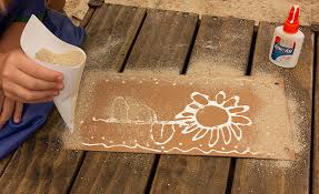 Textured pictures and patterns using coloured sand techniques.